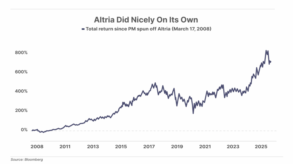 Philip Morris International’s (NYSE: PM) 2008 split from Altria (MO) dropped 15% in its first six months, but delivered 200% gains over four years as international markets boomed.