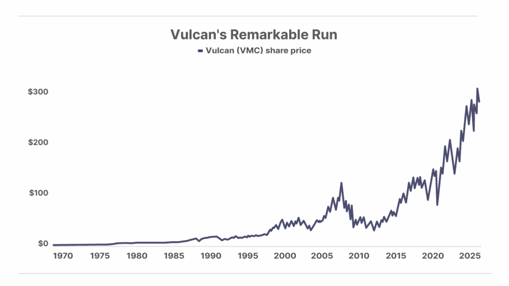 It’s called Vulcan Materials (VMC). It traces its roots to 1909, when Irish immigrant William F. Vulcan founded the Birmingham Slag Company in Alabama. Vulcan figured out how to turn an industrial waste product – steel mill waste – into road-building material. He took what no one wanted and made it useful, constructing roads across the South as the automotive boom transformed America.