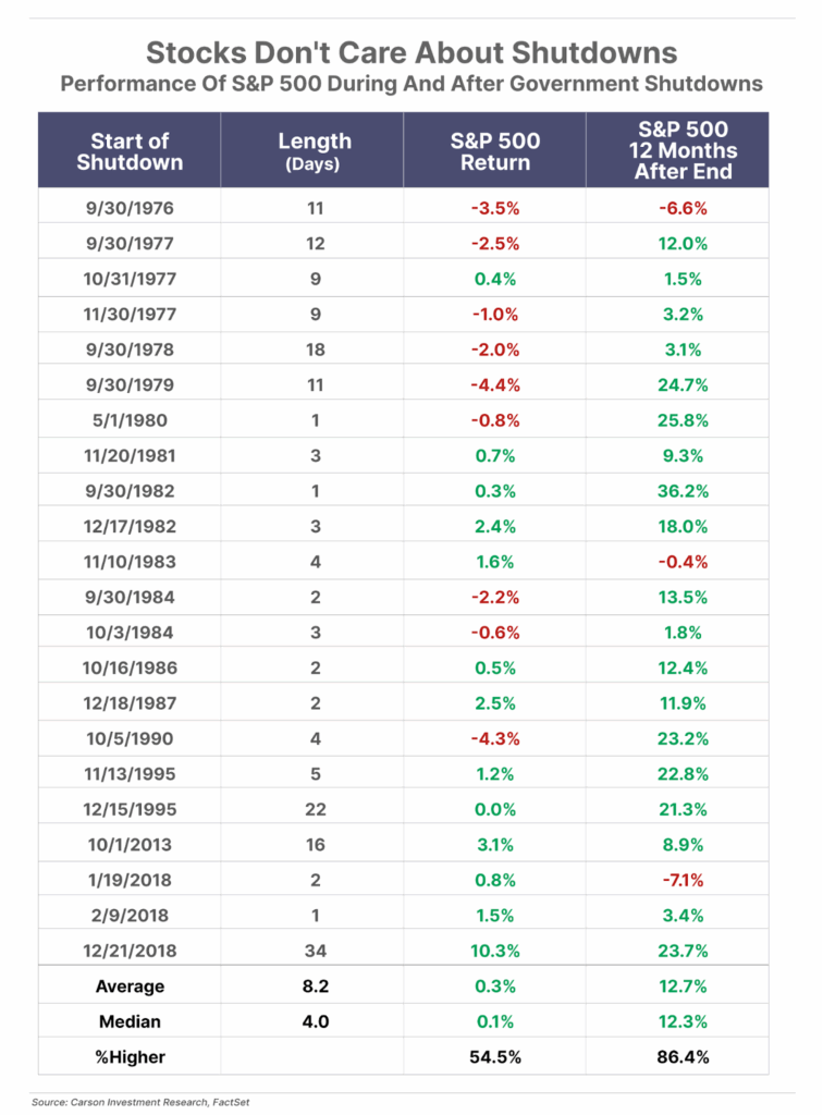 1. The government shutdown begins. History shows that the market shrugs off shutdowns. Since 1950, there have been 22 shutdowns, averaging 8.2 days. During the shutdown itself, the S&P 500’s return has historically been flat. However, 12 months after the government reopens, the index has delivered an average gain of 12.7%, with positive returns 86% of the time. The most recent shutdown, during President Donald Trump’s first term, lasted 34 days – the longest on record. The S&P gained 10.3% during those 34 days and went on to return 23.7% over the following 12 months.
