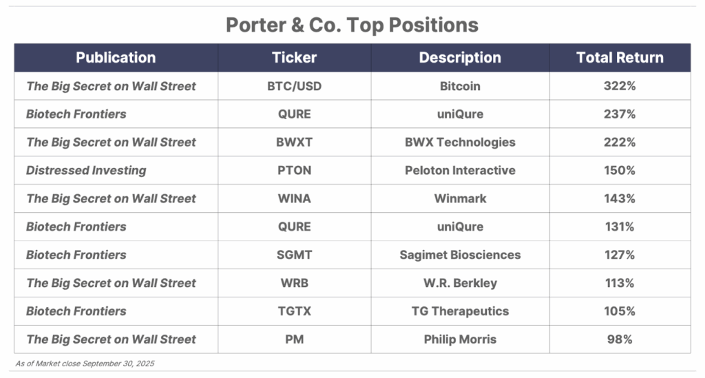 Please note: The investments in our “Porter & Co. Top Positions” should not be considered current recommendations. These positions are the best performers across our publications – and the securities listed may (or may not) be above the current buy-up-to price. To learn more, visit the current portfolio page of the relevant service, here. To gain access or to learn more about our current portfolios, call our Customer Care team at 888-610-8895 or internationally at +1 443-815-4447.