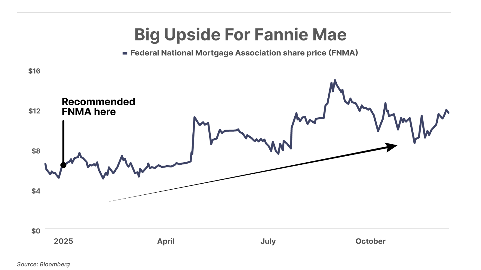 Naturally, not all of those recommendations work out. Just last week, we removed Burford Capital (NYSE: BUR) from Complete Investor as well as from Asymmetry, because it didn’t perform as expected and we didn’t see great potential going forward… but our Asymmetry recommendations of Fannie Mae (OTC: FNMA) and Freddie Mac (OTC: FMCC) are both up around 70% since February – when I predicted that U.S. President Donald Trump would take them out of conservatorship.