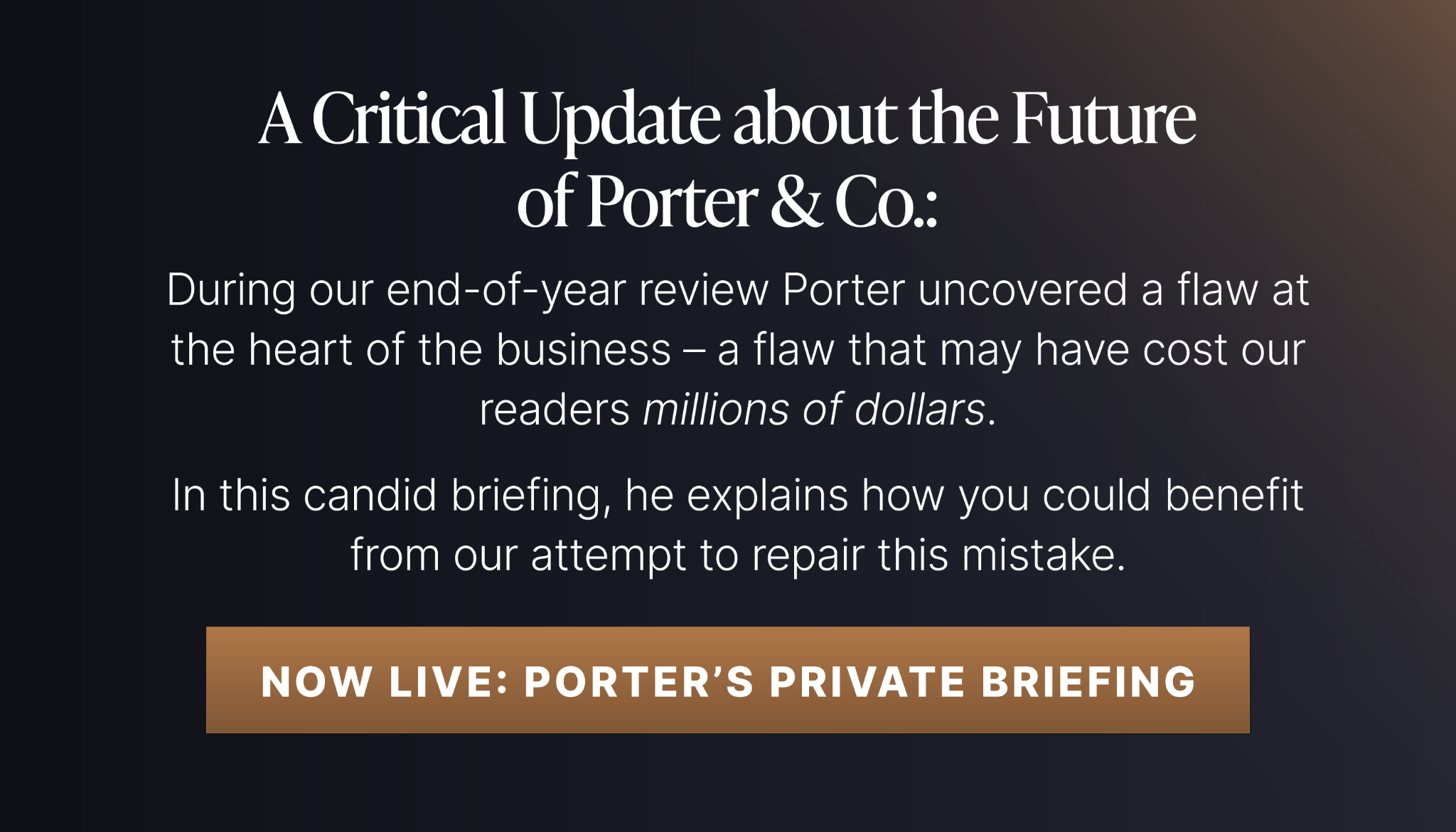 This is Porter’s Daily Journal, a free e-letter from Porter & Co. that provides unfiltered insights on markets, the economy, and life to help readers become better investors. It includes weekday editions and two weekend editions… and is free to all subscribers.