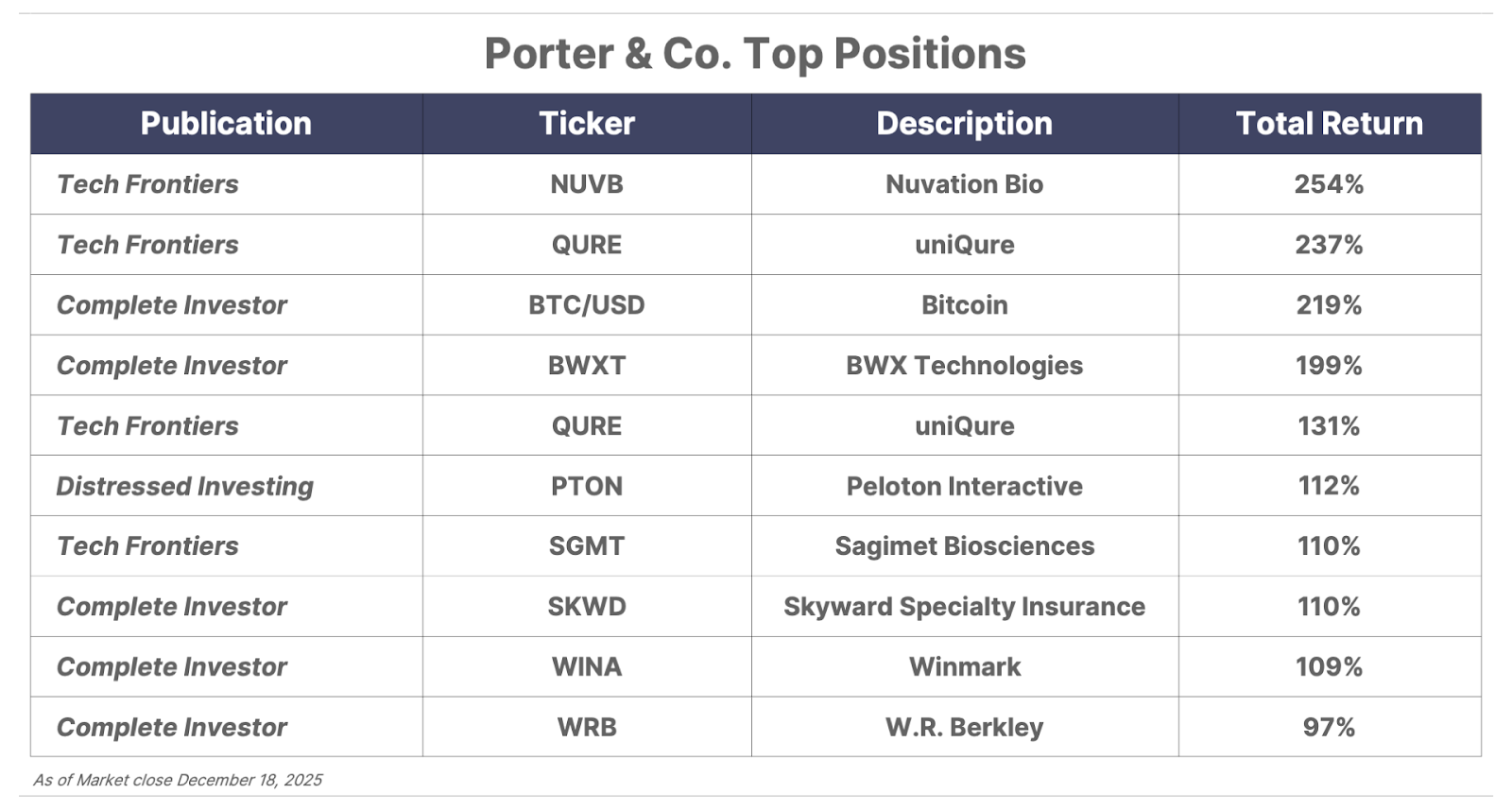 Please note: The investments in our “Porter & Co. Top Positions” should not be considered current recommendations. These positions are the best performers across our publications – and the securities listed may (or may not) be above the current buy-up-to price. To learn more, visit the current portfolio page of the relevant service, here. To gain access or to learn more about our current portfolios, call our Customer Care team at 888-610-8895 or internationally at +1 443-815-4447.