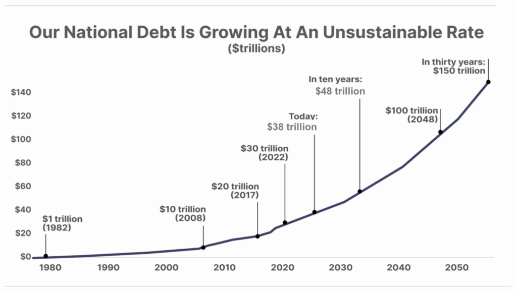 1. The debt spiral accelerates. U.S. national debt just surged past $38 trillion, two months after crossing $37 trillion and running a $5.1 trillion pace in new borrowing. The Congressional Budget Office projects total federal debt to reach $140 trillion by 2054, a level that would dwarf the productive capacity of the economy and the current M2 money global money supply today (roughly $100 trillion). The debt machine – and by extension the money printer – shows no sign of slowing; in fact, the pace is accelerating. Interest payments are consuming an ever-larger share of the federal budget, while bondholders are beginning to question the long-term sustainability of U.S. creditworthiness and the government’s ability to honor its obligations without perpetual monetization.