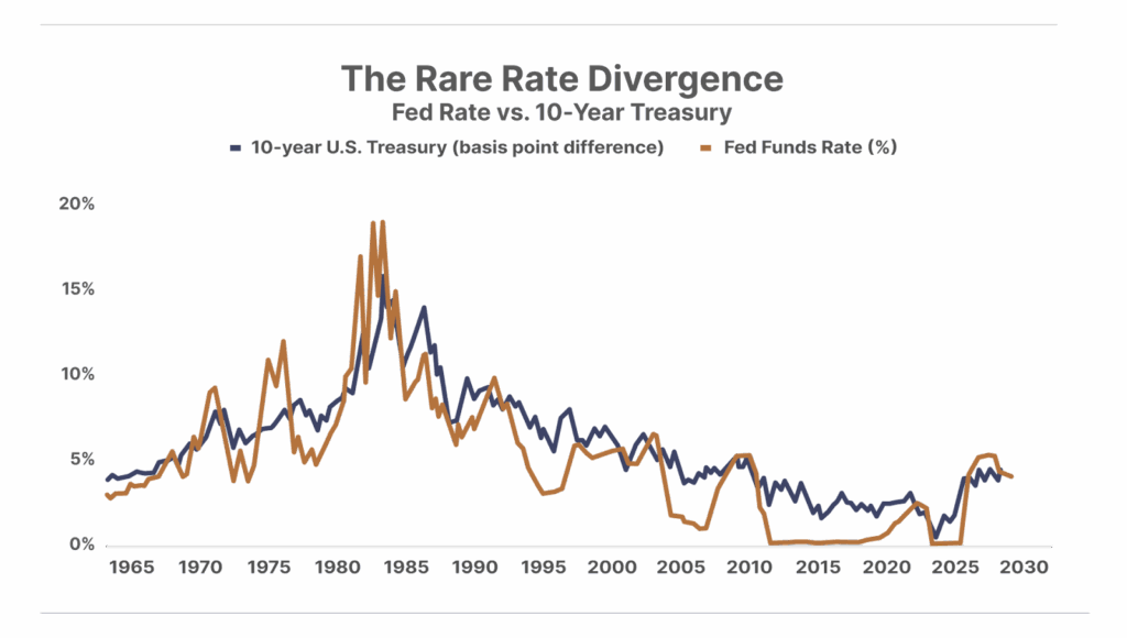 3. Diverging rates are unusual. The Fed cut interest rates by 25 basis points on October 29, and instead of also falling, as it almost always does, the rate on 10-year U.S.Treasuries rose 9 basis points that day… For context, the 10-year Treasury rate went down during the previous six phases of Fed rate-cutting. While the Fed controls short-term interest rates, longer-term bond yields are normally set by market forces. So this divergence of the 10-year rising while Fed rates fell is unusual. Longer-term bond yields’ opposite-way movement may reflect lingering fears of tariff-induced inflation. Also, the massive investments from overseas that President Donald Trump extracted in trade negotiations may create large demand for debt capital, exerting upward pressure on bond yields.