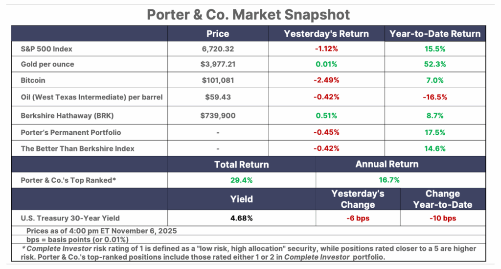 This is Porter’s Daily Journal, a free e-letter from Porter & Co. that provides unfiltered insights on markets, the economy, and life to help readers become better investors. It includes weekday editions and two weekend editions… and is free to all subscribers.