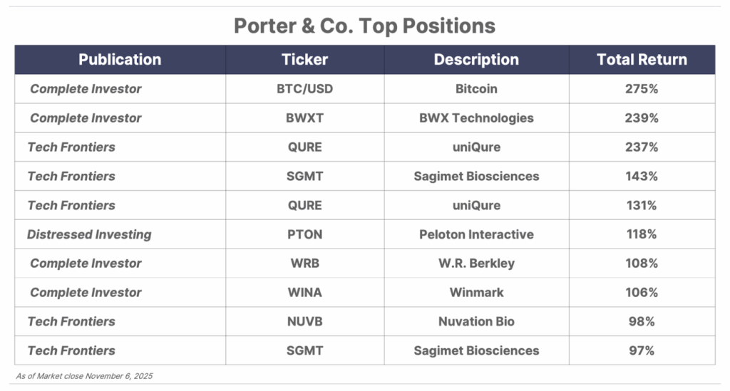 Please note: The investments in our “Porter & Co. Top Positions” should not be considered current recommendations. These positions are the best performers across our publications – and the securities listed may (or may not) be above the current buy-up-to price. To learn more, visit the current portfolio page of the relevant service, here. To gain access or to learn more about our current portfolios, call our Customer Care team at 888-610-8895 or internationally at +1 443-815-4447.