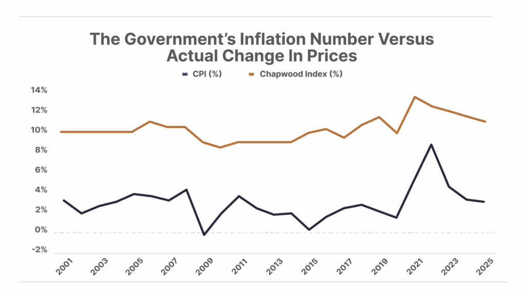 Maybe you’ve noticed that inflation isn’t going away. It’s nowhere near 2% that’s supposedly the target. Meanwhile, healthcare costs are soaring, which, along with tariffs (which will eventually cause much higher consumer prices), is going to drive CPI much higher than expected in 2026 and 2027. We already know from privately compiled data (see the Chapwood Index, for example), that actual inflation is running between 10% and 12% in most American cities.