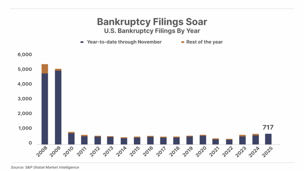 1. Corporate bankruptcies reach a post-financial-crisis record. According to S&P Global, 717 large U.S. companies have filed for bankruptcy year-to-date through November. This exceeds the full-year total for any year since 2010. Large bankruptcies are up 93% since reaching a post-crisis low of 372 in 2022.