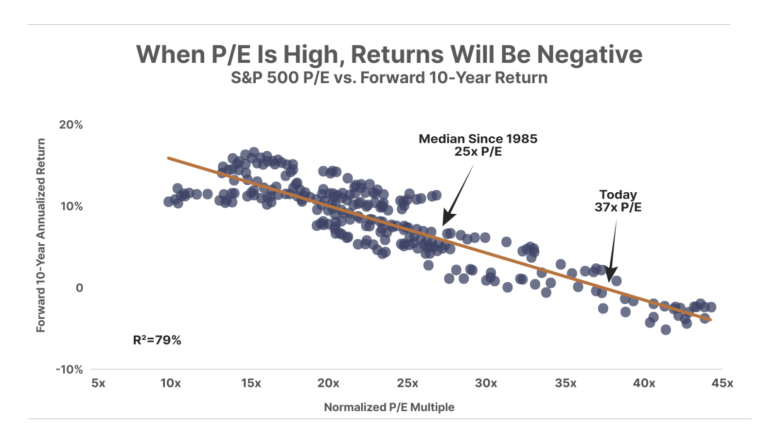 This is among the highest levels ever recorded. Among the very few times stocks were more expensive was during the internet bubble in 2000 (CAPE peaked at 44) and very briefly during the post-COVID boom in 2021.