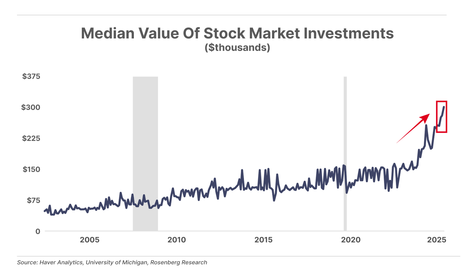 1. Americans have more exposure to stocks than ever before. According to the latest University of Michigan consumer survey, the median value of U.S. investors’ stock market holdings has surpassed $300,000 for the first time. This sum has more than tripled since April 2020 and is up 50% since March of this year. Equities now account for a record 52% of U.S. household wealth, roughly five percentage points above the prior record set during the 2000 dot-com bubble peak.
