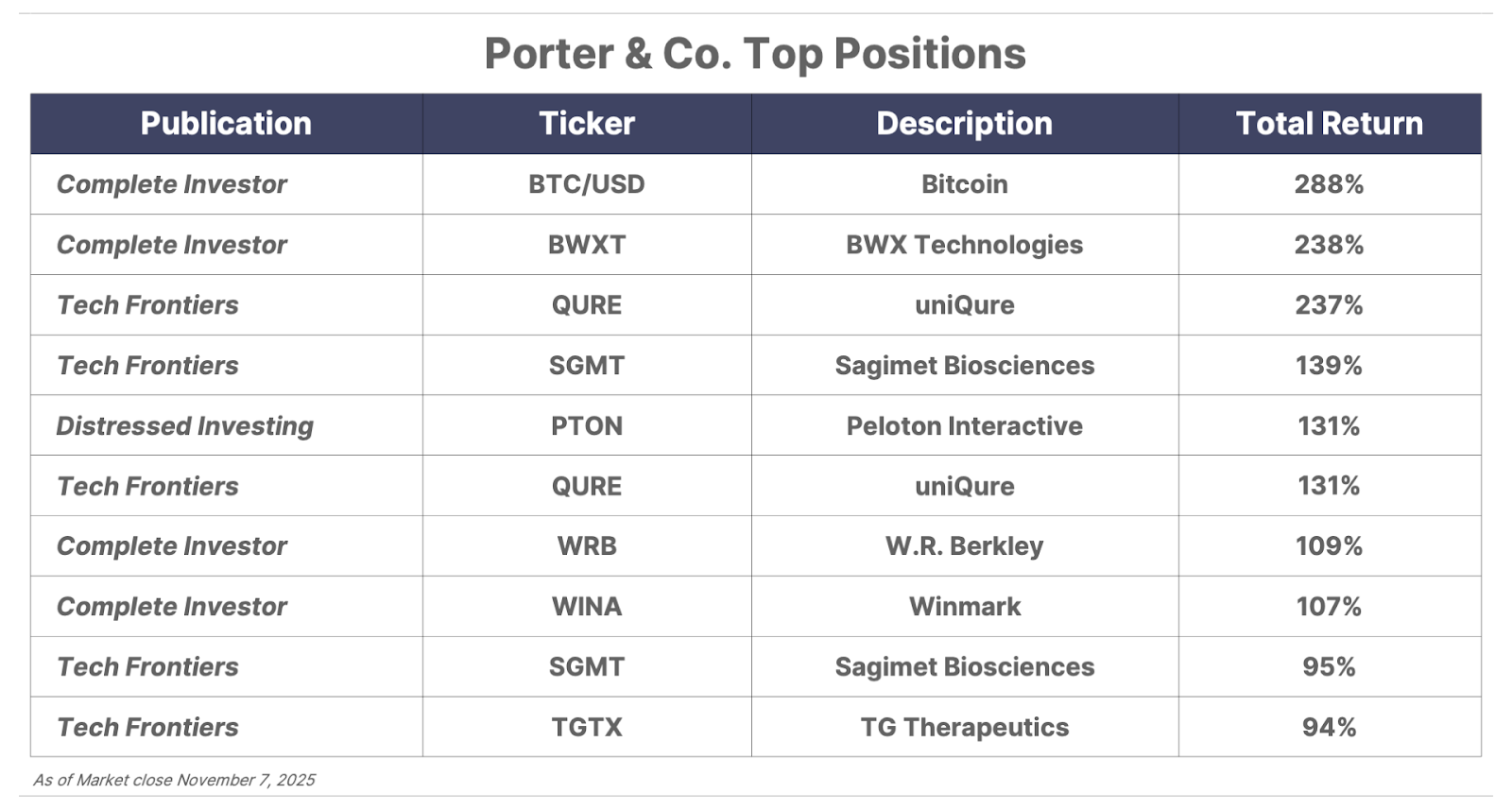 Please note: The investments in our “Porter & Co. Top Positions” should not be considered current recommendations. These positions are the best performers across our publications – and the securities listed may (or may not) be above the current buy-up-to price. To learn more, visit the current portfolio page of the relevant service, here. To gain access or to learn more about our current portfolios, call Lance James, our Director of Customer Care, at 888-610-8895 or internationally at +1 443-815-4447.